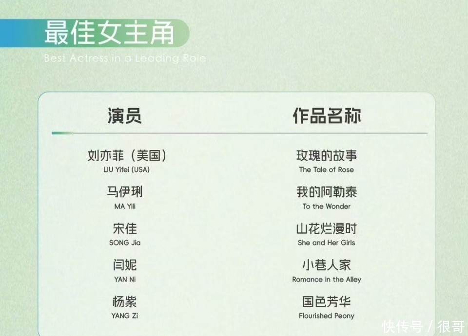 最好女主角的提名更是星光熠熠,刘亦菲、马伊琍、宋佳、闫妮、杨紫王人是实力派女演员。