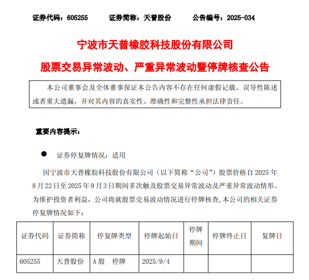 9月3日晚间,天普股份(605255)(605255.SH)发布公告,因公司股票价钱自2025年8月22日至2025年9月3日历间屡次波及股票往返极端波动及严重极端波动情形,公司股票将于2025年9月4日(星期四)开市起停牌,自浮现核查公告后复牌。