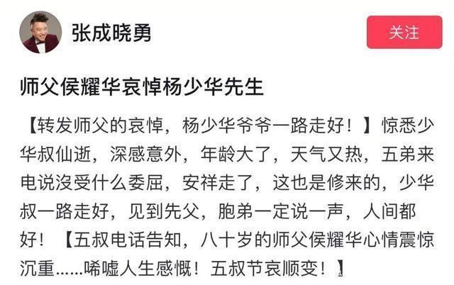 从侯耀华的整个情景来看,可以说是特别的好。而此前杨少华先生失掉时,他称体格抱恙,如故请托门徒张成晓勇代为发文,抒发对杨老爷子的哀念念。