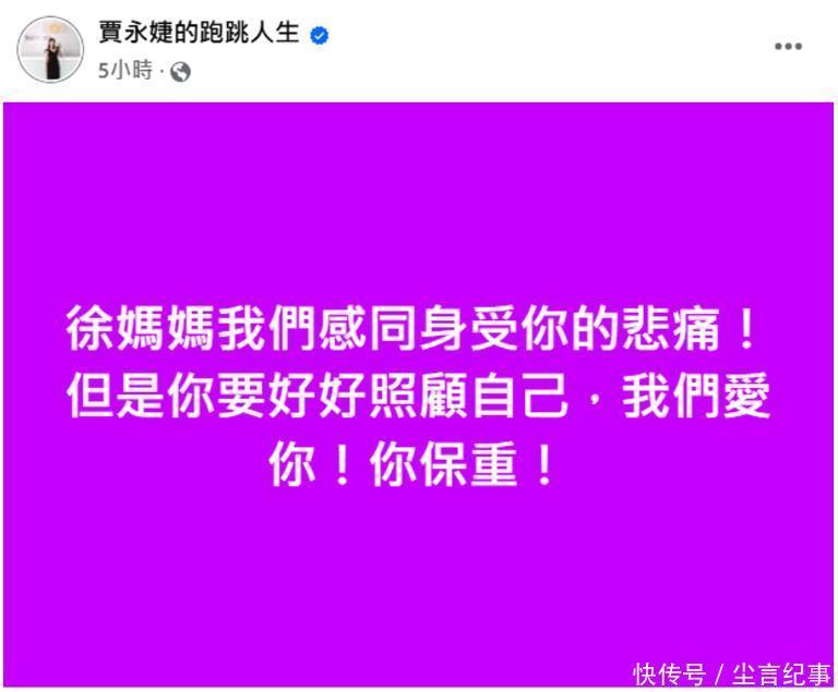 如今S家东谈主靠近着浩繁的压力,22日,贾永婕发文:“徐姆妈咱们装疯卖傻你的悲悼!但你休好好珍贵我方,咱们爱你!你保重!”