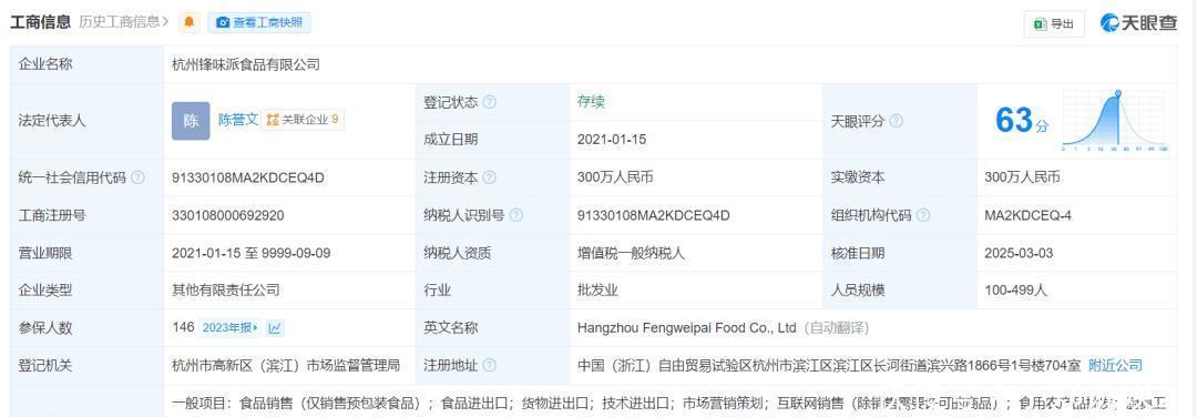 天眼查自满,杭州锋味派食物有限公司设置于2021年1月,法定代表东谈主为陈誉文,注册成本300万元东谈主民币,缠绵范畴包括食物销售、食物出进口、市集营销策动、互联网销售等。鼓舞信息自满,该公司由杭州谦谈电子商务有限公司、锋味(北京)食物时期有限公司、北京菲猎电子商务有限公司共同握股。