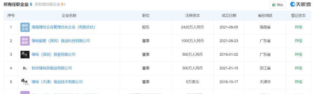 据天眼查,2016年-2021年,谢霆锋在内地统共任职公司一共有6家:锋味船歌(深圳)食物科技有限公司、锋味(深圳)贸易有限公司、锋味(天津)食物时期有限公司、锋蜜(上海)影视文化使命室、海南锋投企业处置合伙企业、杭州锋味派食物有限公司,业务波及食物、贸易、影视、企管等多个限度。