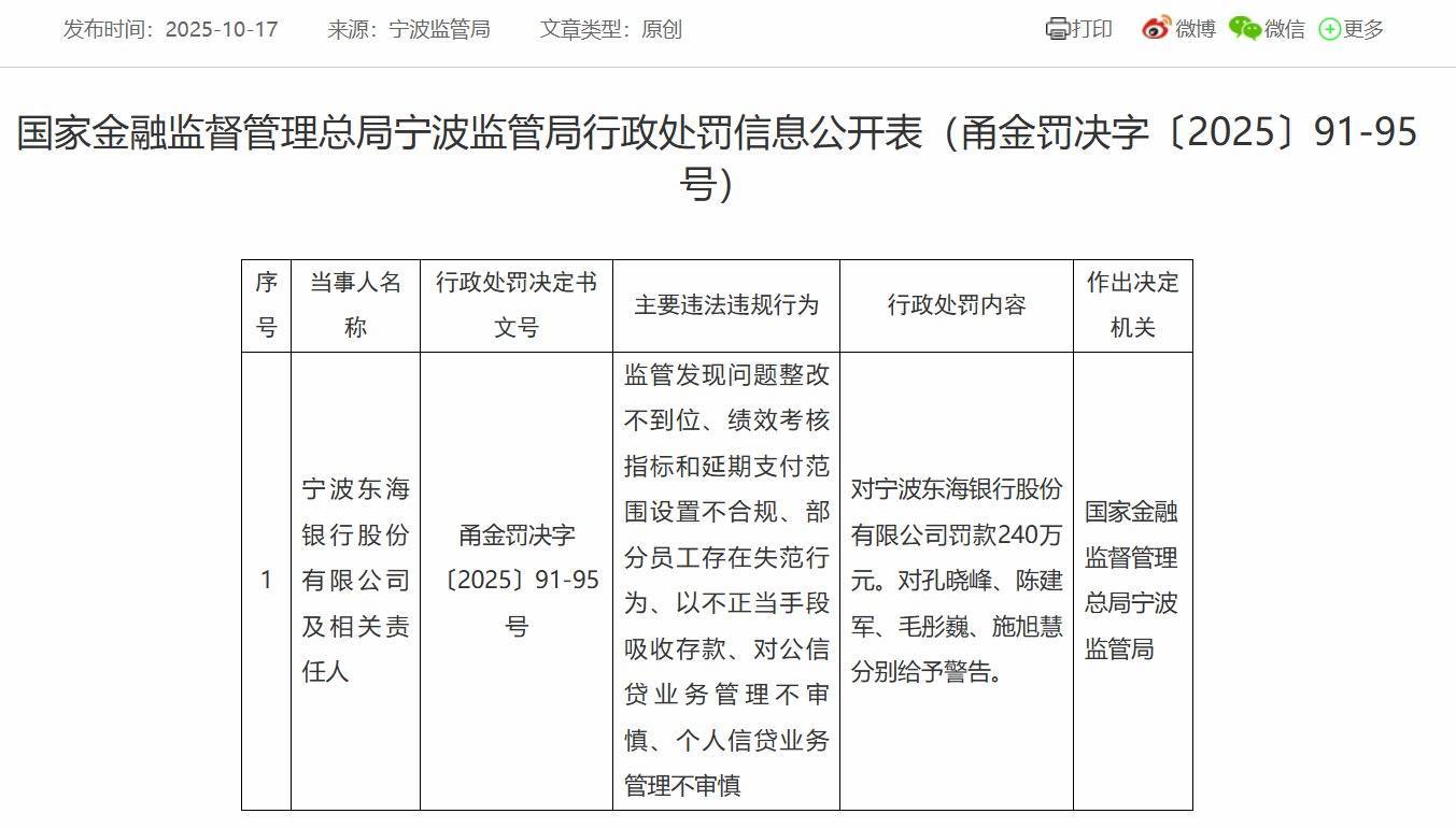 【大河财立方音信】10月18日音信欧洲杯app,国度金融监督处治总局宁波监管局行政处罚信息公开表显现,宁波东海银行股份有限公司被罚240万元。